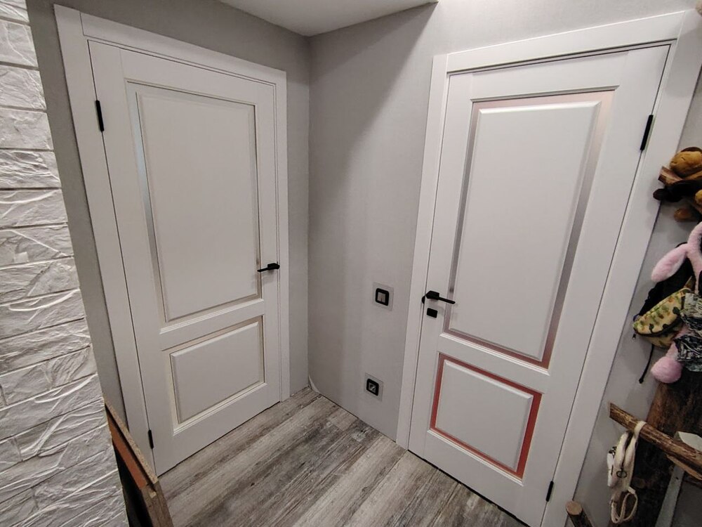 Филёнчитая дверь, безпустотная стоевая с использованием LVL-бруса и MDF, филёнка МДФ 8+8 мм. Покрытие полипропилен, производства Корея в белом и сером оттенках. Толщина полотна 36 мм.