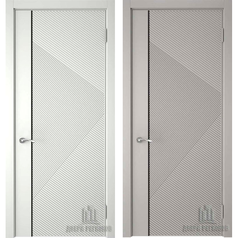 Дверь в современном стиле с фрезеровками и молдингом. Идёт в двух базовых оттенках: белом и сером. PVC покрытие полотна «Эмалекс» с защитным слоем лака является более бюджетной альтернативой эмали, визуально создаёт тот же эффект.