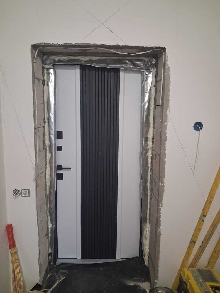 Тип короба: «Разорванный многокамерный» с утеплителем из каменной ваты + ПВХ спейсер двухкамерный 25мм + воздушная камера, толщина короба 150 мм, защита от промерзания и шума. Усиленный металлический бронекарман под ригеля замка.