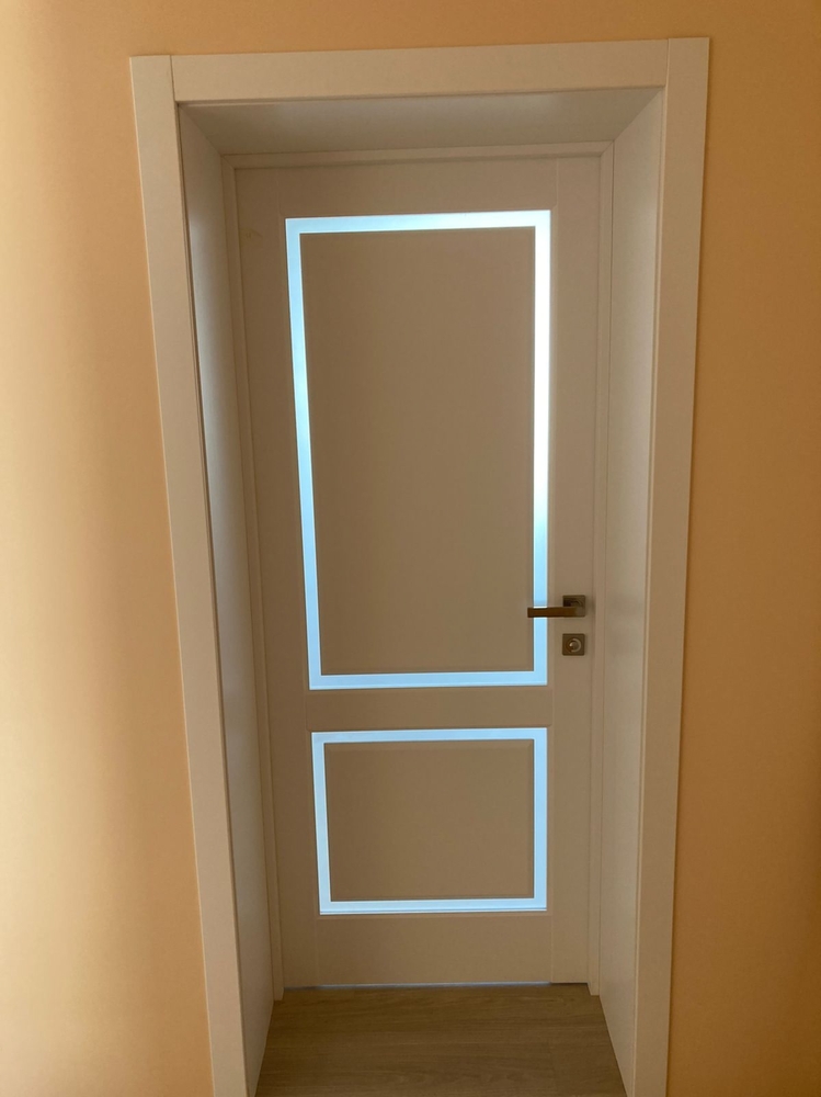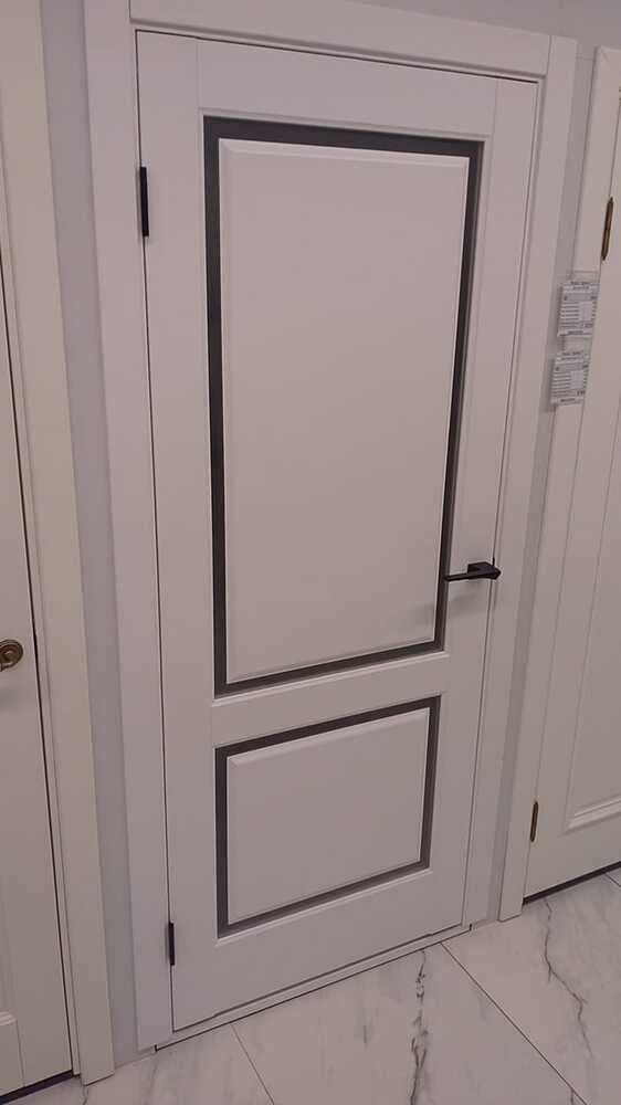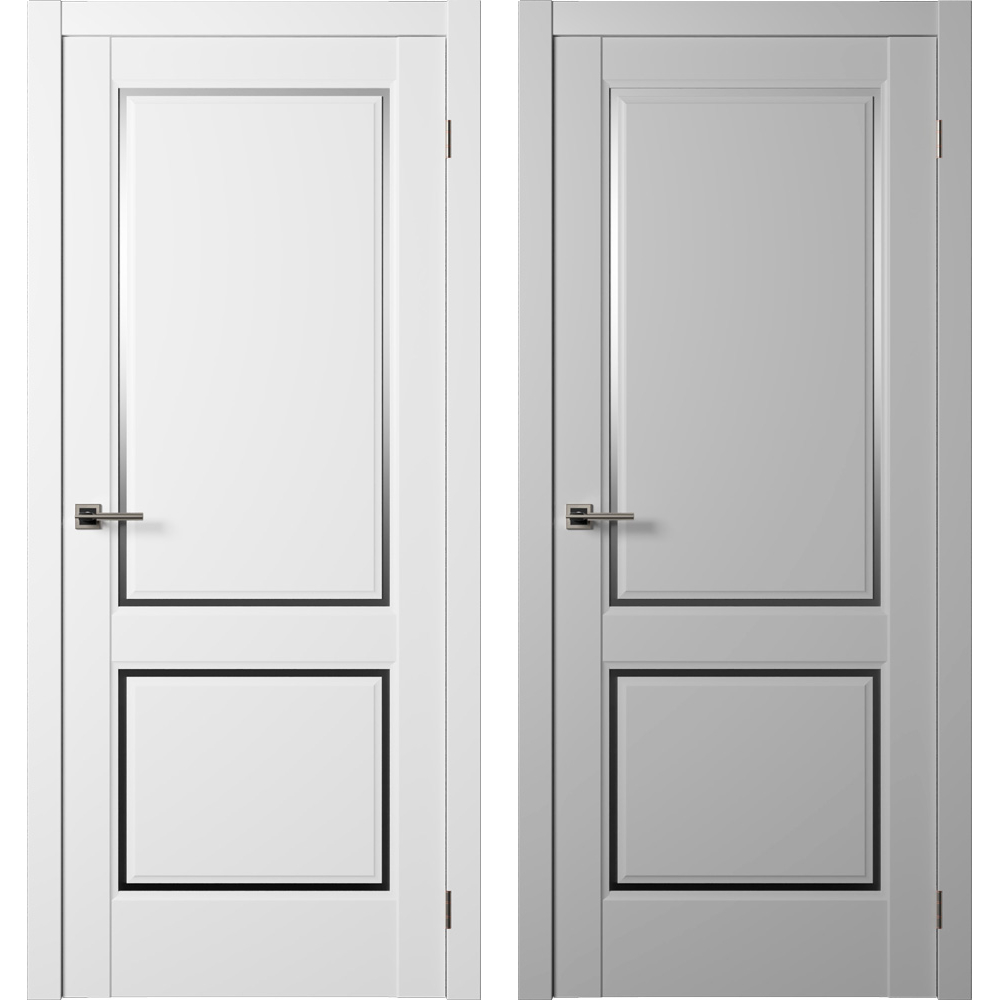 Филёнчитая дверь, безпустотная стоевая с использованием LVL-бруса и MDF, филёнка МДФ 8+8 мм. Покрытие полипропилен, производства Корея в белом и сером оттенках. Толщина полотна 36 мм.