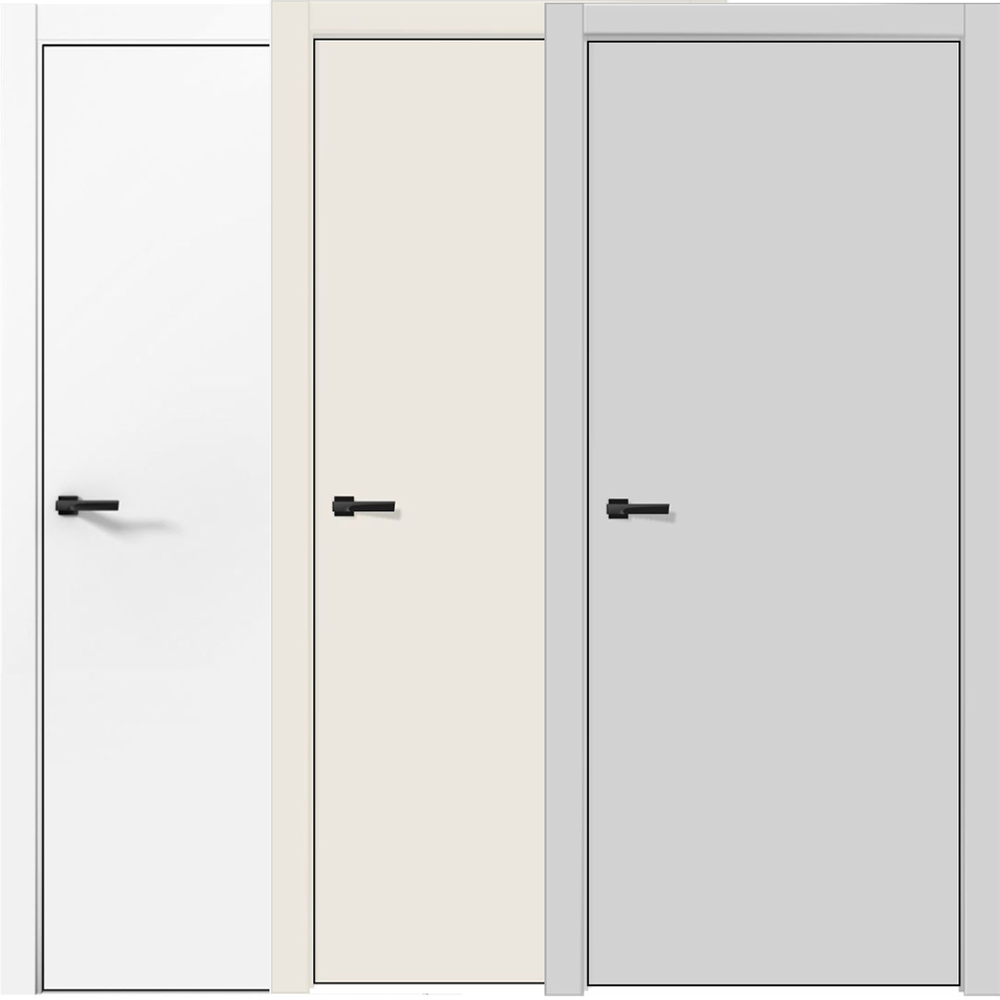 Межкомнатная дверь без декора с алюминиевой чёрной кромкой с четырёх сторон - минималистичный декор и практичное решение, защищающее дверь в самом уязвимом месте. Фабрика предоставляет модель в трёх нейтральных оттенках: белом матовом, светло-сером и кварцит