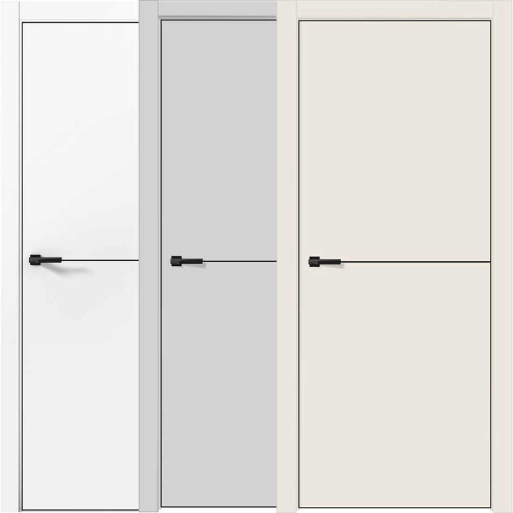 Межкомнатная дверь с горизонтальным тонким молдингом и алюминиевой чёрной кромкой с четырёх сторон - минималистичный декор и практичное решение, защищающее дверь в самом уязвимом месте. Фабрика предоставляет модель в трёх нейтральных оттенках: белом матовом, светло-сером и кварцит