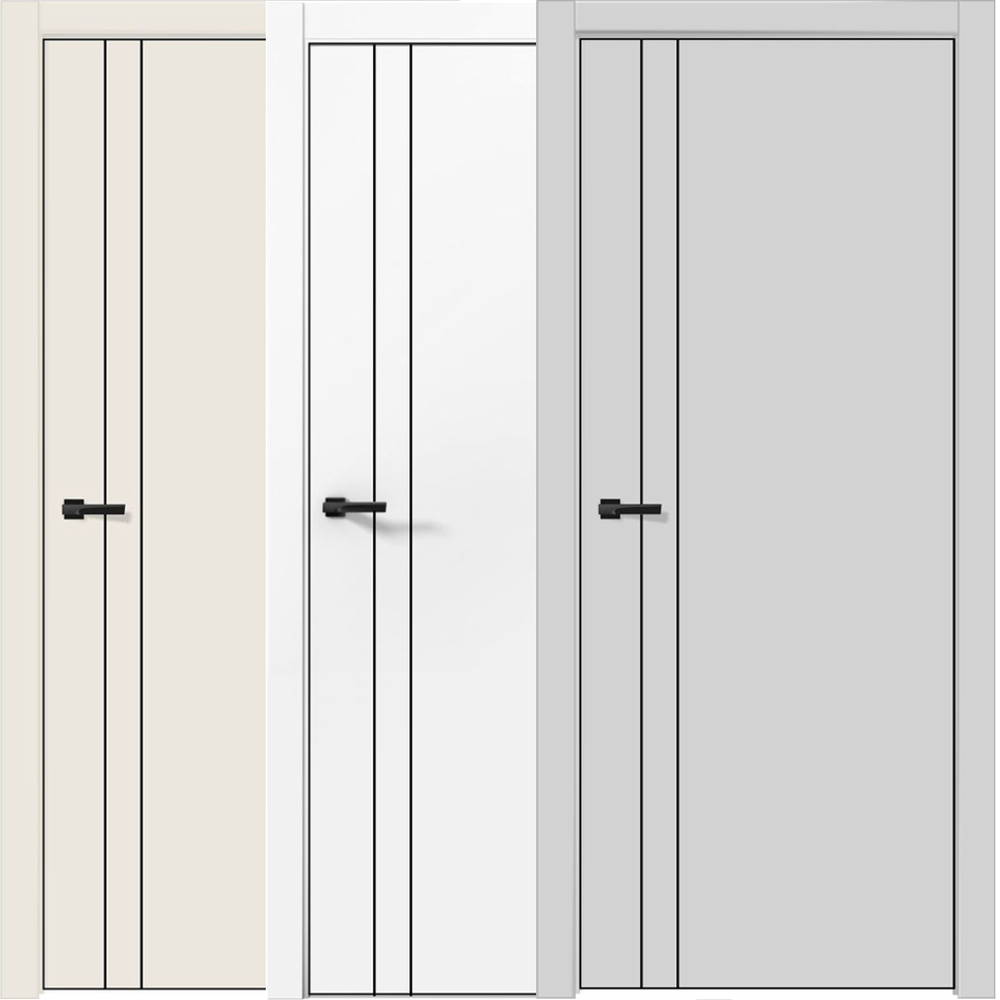 Межкомнатная дверь с двумя вертикальными тонкими молдингами и алюминиевой чёрной кромкой с четырёх сторон - минималистичный декор и практичное решение, защищающее дверь в самом уязвимом месте. Фабрика предоставляет модель в трёх нейтральных оттенках: белом матовом, светло-сером и кварцит