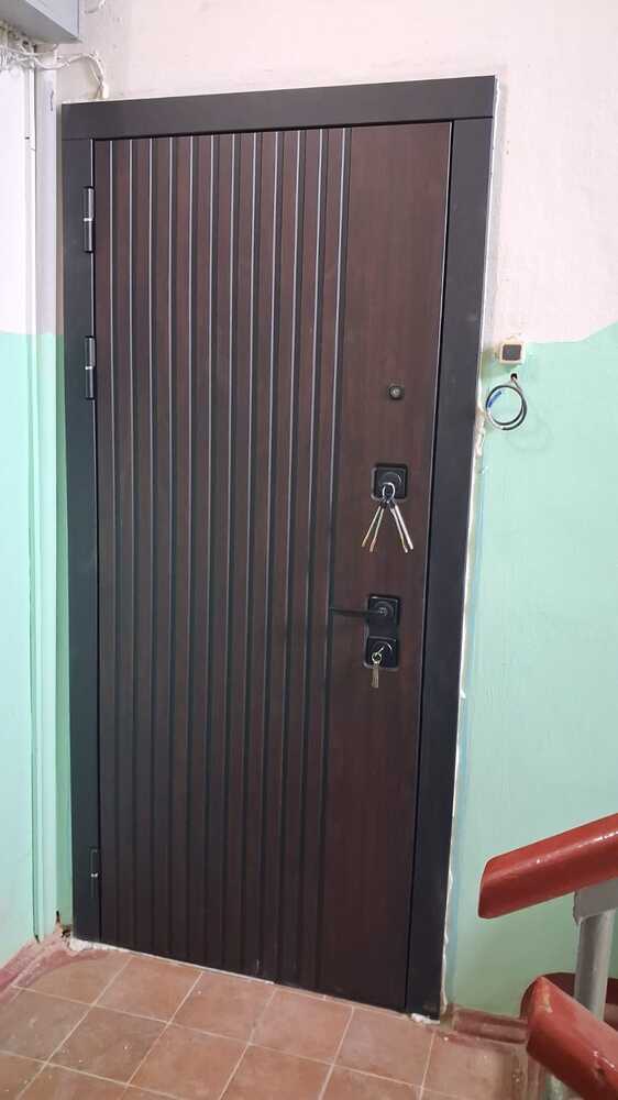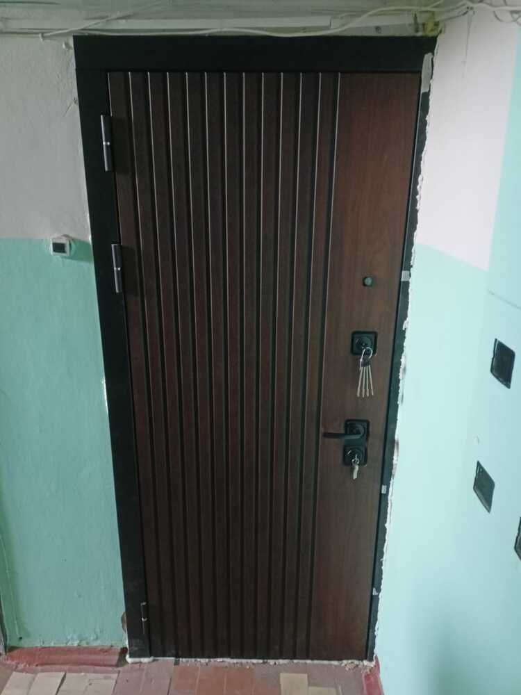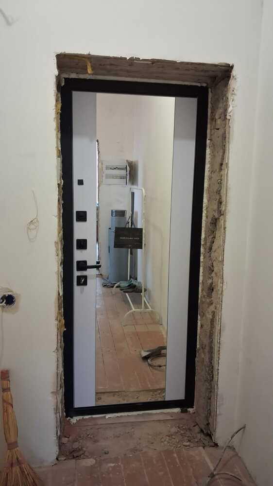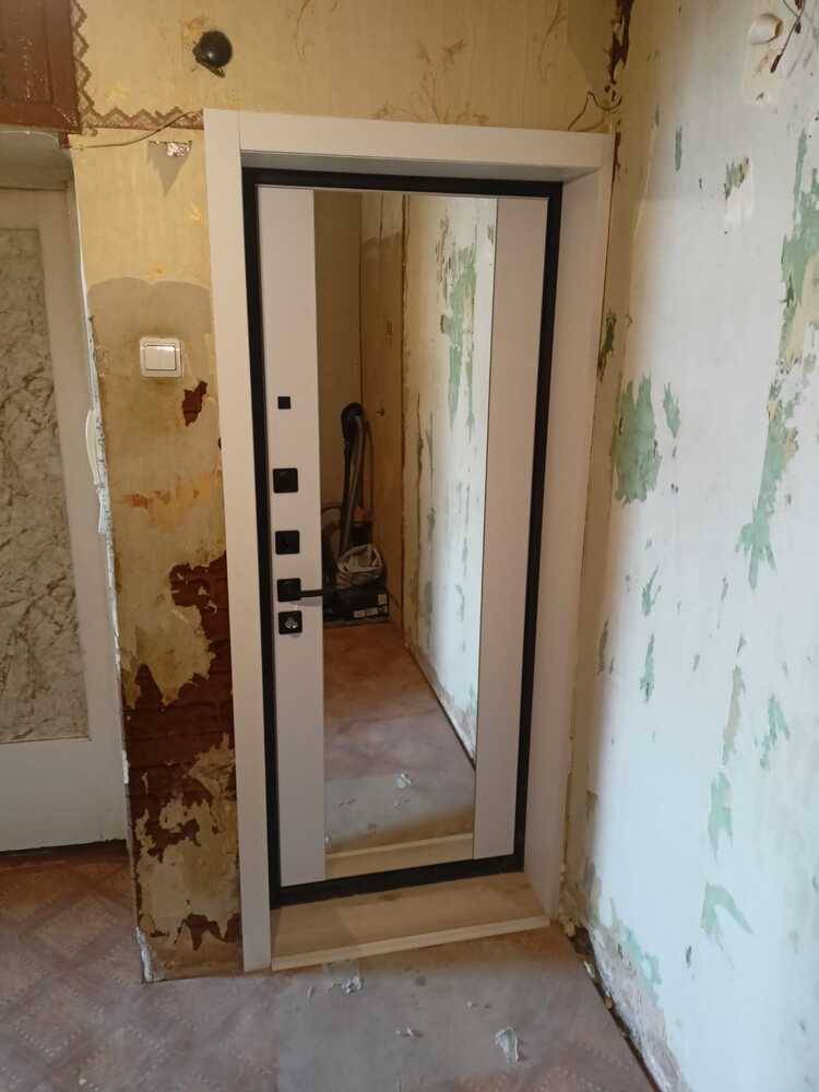 Отделка: внешняя панель с покрытием Мореная береза премиум + черная патина, 10 мм / внутренняя панель 12 мм МДФ в цвете SOFT Белый / наличники в цвете черная шагрень, зеркальная вставка МАКСИ